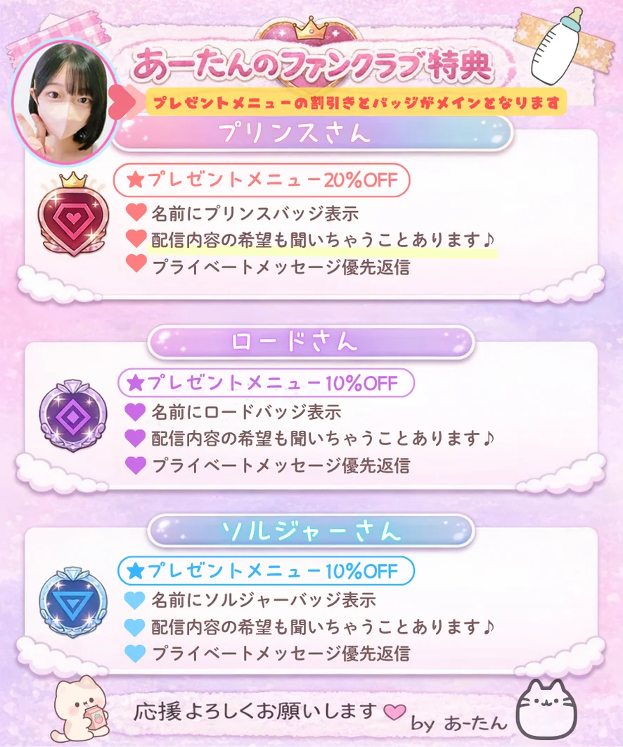 主に、バッジ獲得とプレゼントメニューの割引がメインとなります。